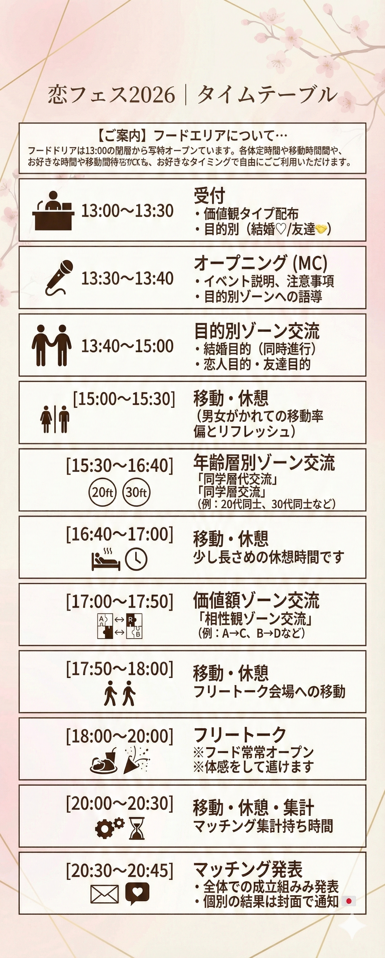 でも恋フェスの“困ったときブース”と“キューピット”のおかげで、 自分から話しかけなくても自然に会話が始まって、 気づいたら楽しめていました! 💬 30代 男性・会社員